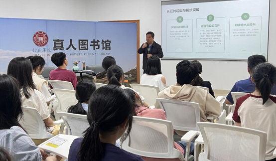 在讲座过程中,黄仂教授还提到了毛泽东主席的诗词《清平乐·六盘山》,并邀请同学们一起朗诵毛泽东主席的《七律·长征》。当“红军不怕远征难,万水千山只等闲……”的诗句在"真人图书馆”厅内响起时,现场气氛热烈,同学们被长征精神深深感染,纷纷沉浸其中。
