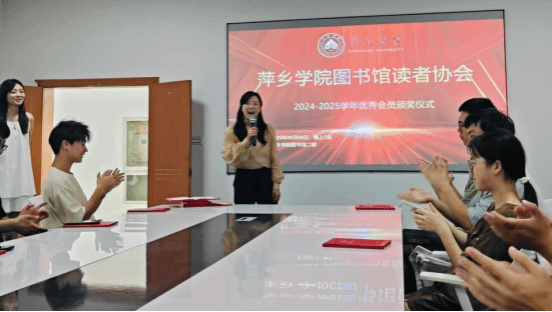 2025年6月6日晚7时,萍乡学院图书馆读者协会2024-2025学年年度优秀会员颁奖仪式在图书馆二楼活动室隆重举行。图书馆指导老师与协会全体成员齐聚一堂,共同见证这一荣耀时刻。