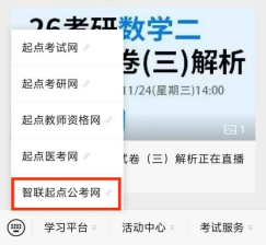 2)在“学习平台”中点击“智联起点公考网”账号登陆使用(第一次使用需注册账号,注册账号必须在校园IP范围内,选择本校,填写相关信息进行注册)