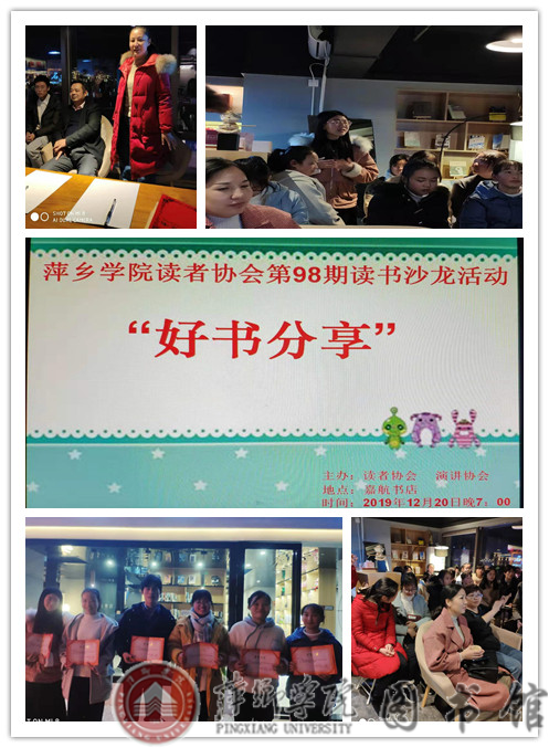 2019年12月20日晚上19:00,萍乡学院读者协会联合创新创业学院嘉航书店举办第98期青年读书沙龙活动“好书分享”。萍乡学院党委委员田常红、学工处处长肖国正、创新创业学院吴琼老师、商学院吴艳老师、图书馆吴玉华老师、图书馆读者协会指导老师李小玲、读者协会成员及演讲协会成员参加此次活动,活动由程娜与肖夜平主持。